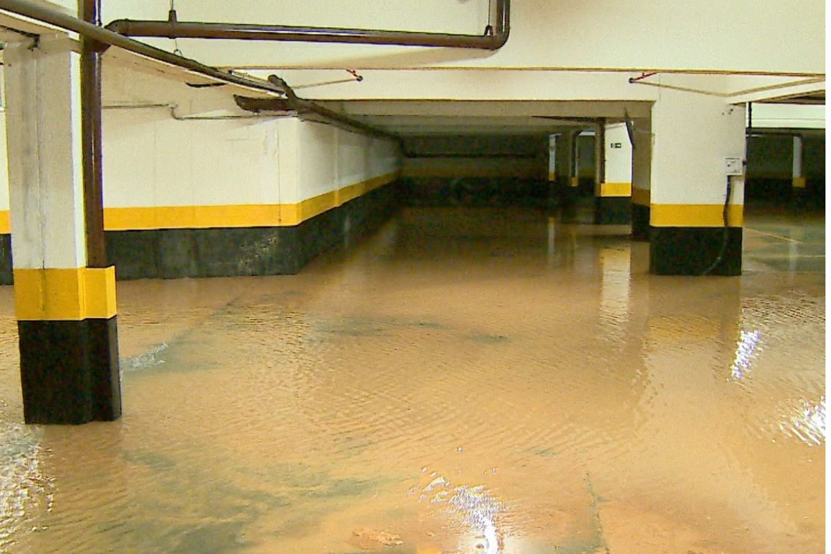 Garagens de prédios são inundadas após cano ser atingido durante obra em cratera, em São José dos Campos